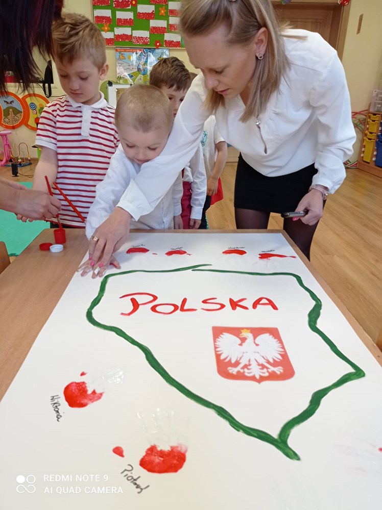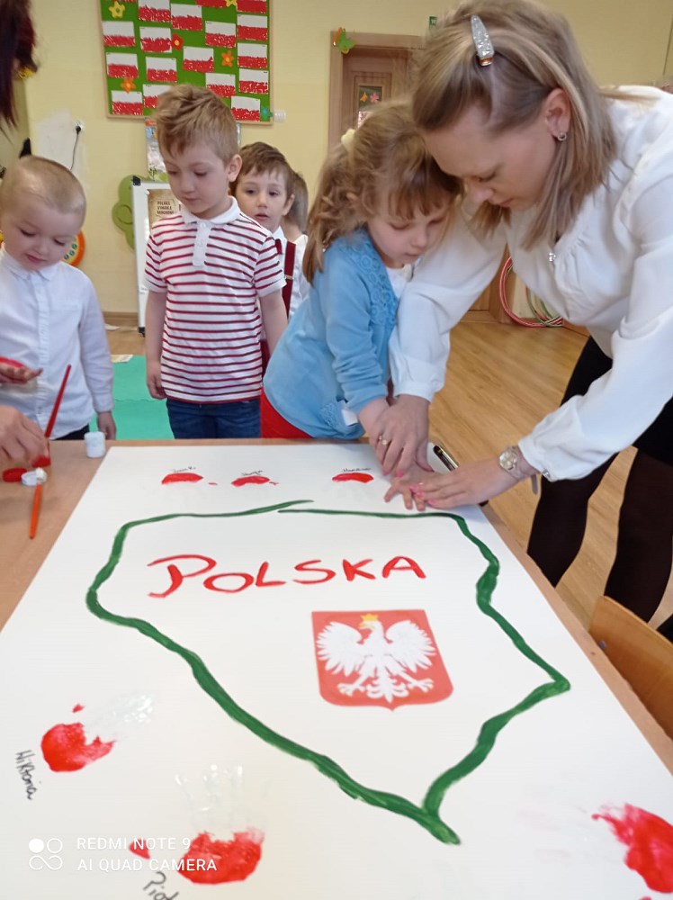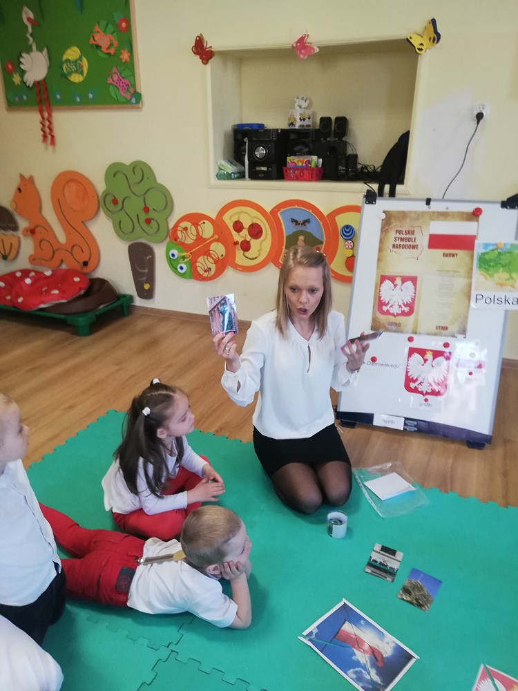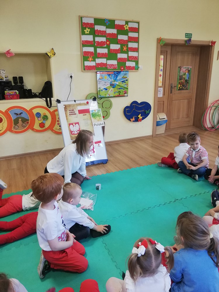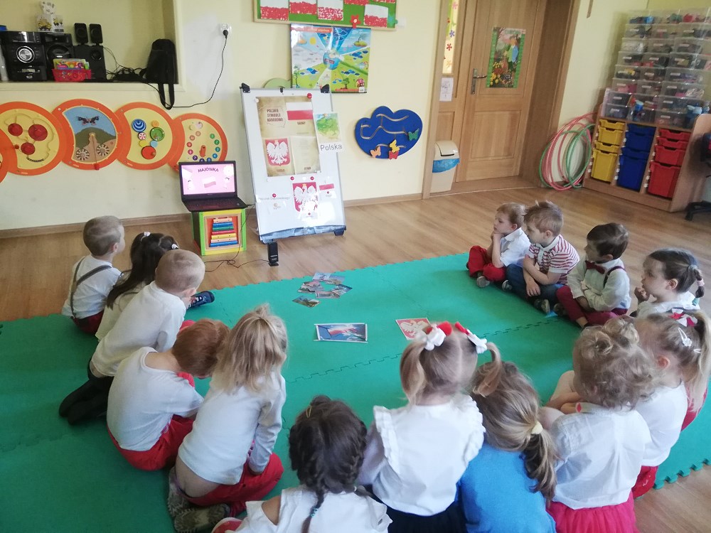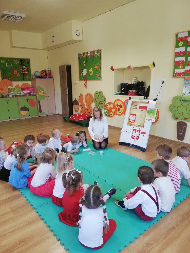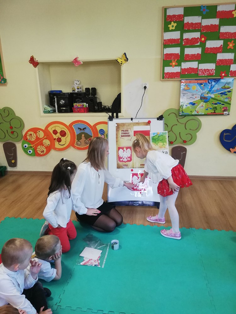 Przedszkolaki poznały symbole narodowe: godło, flagę oraz hymn Polski. Wspólnie wykonały plakat patriotyczny. Na zakończenie dnia, wspólnie odśpiewały piosenki patriotyczne oraz hymn Polski. Każdy przedszkolak wykonał samodzielnie biało – czerwoną flagę.