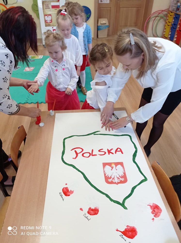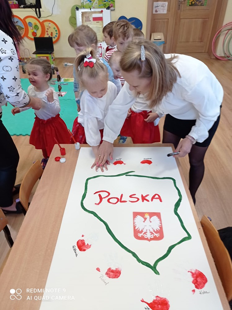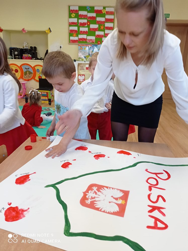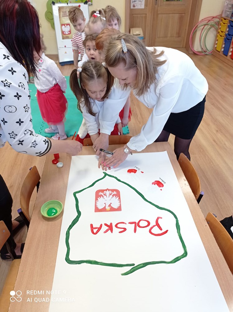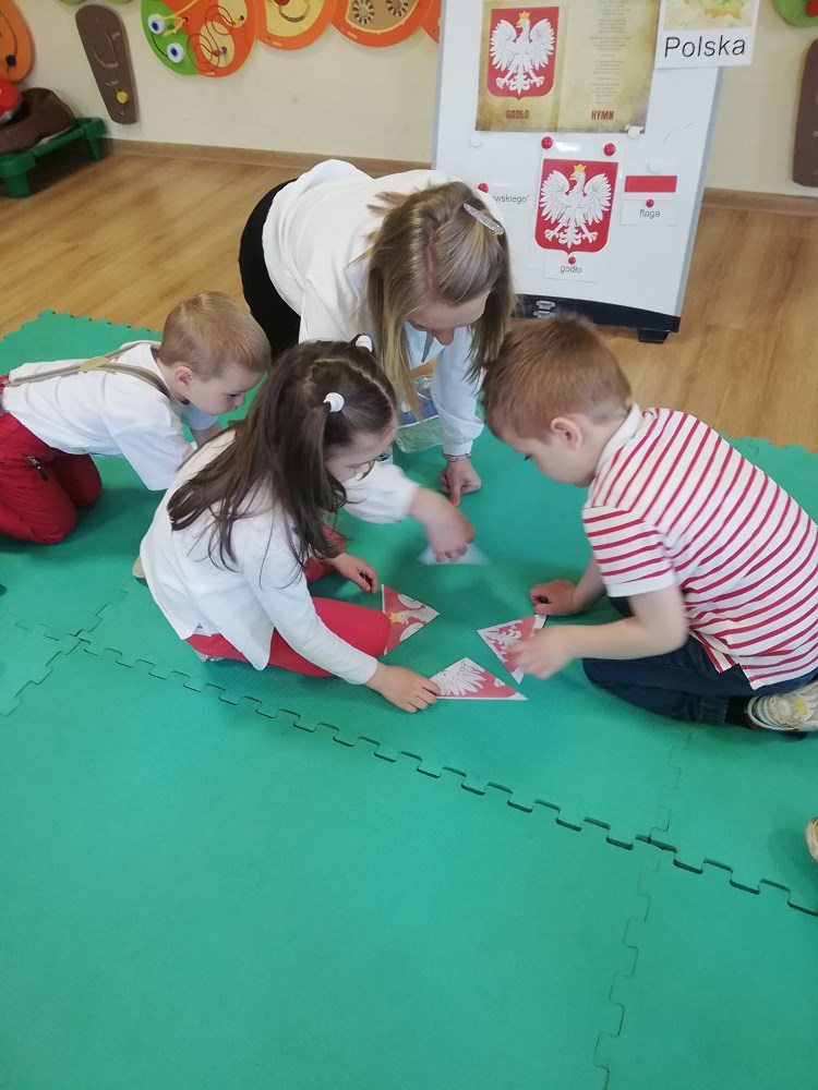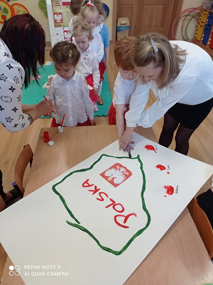 Przedszkolaki poznały symbole narodowe: godło, flagę oraz hymn Polski. Wspólnie wykonały plakat patriotyczny. Na zakończenie dnia, wspólnie odśpiewały piosenki patriotyczne oraz hymn Polski. Każdy przedszkolak wykonał samodzielnie biało – czerwoną flagę.