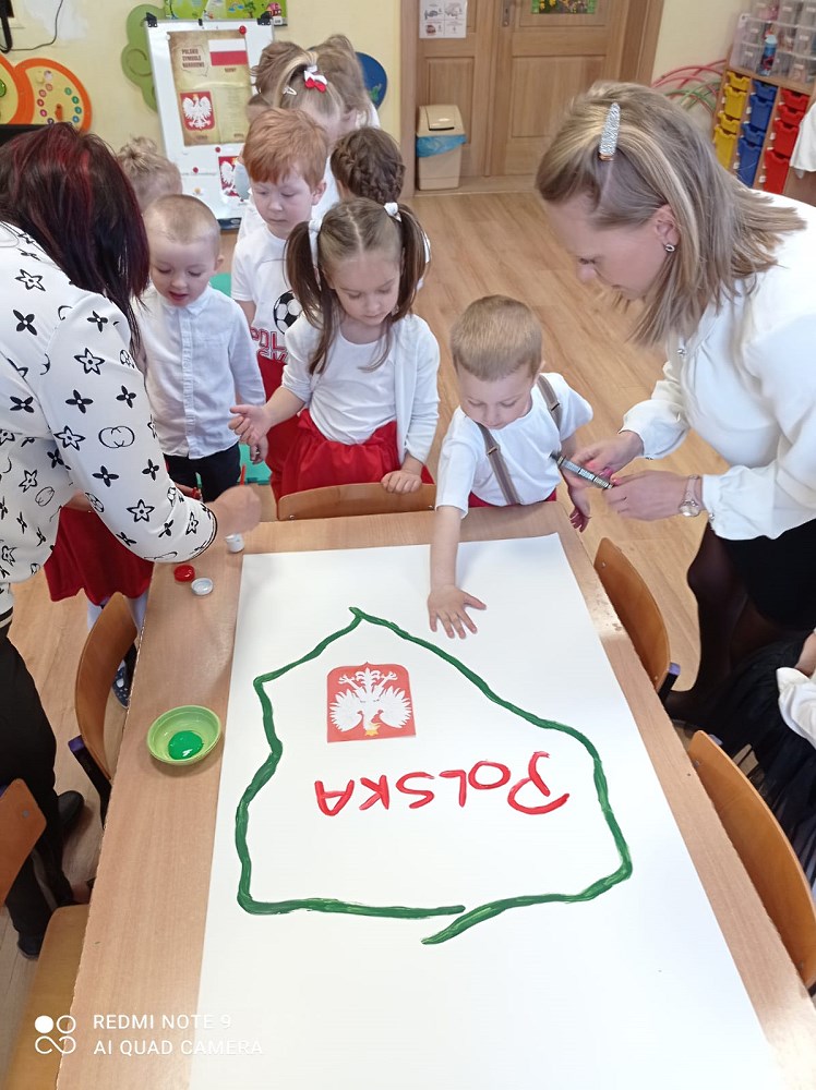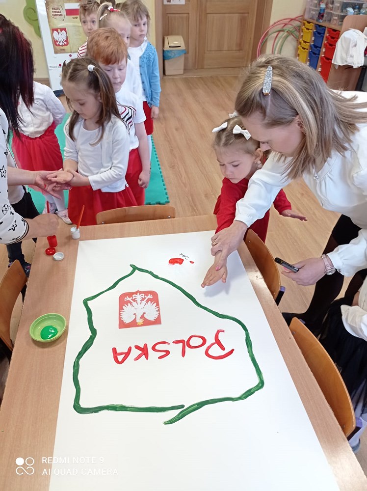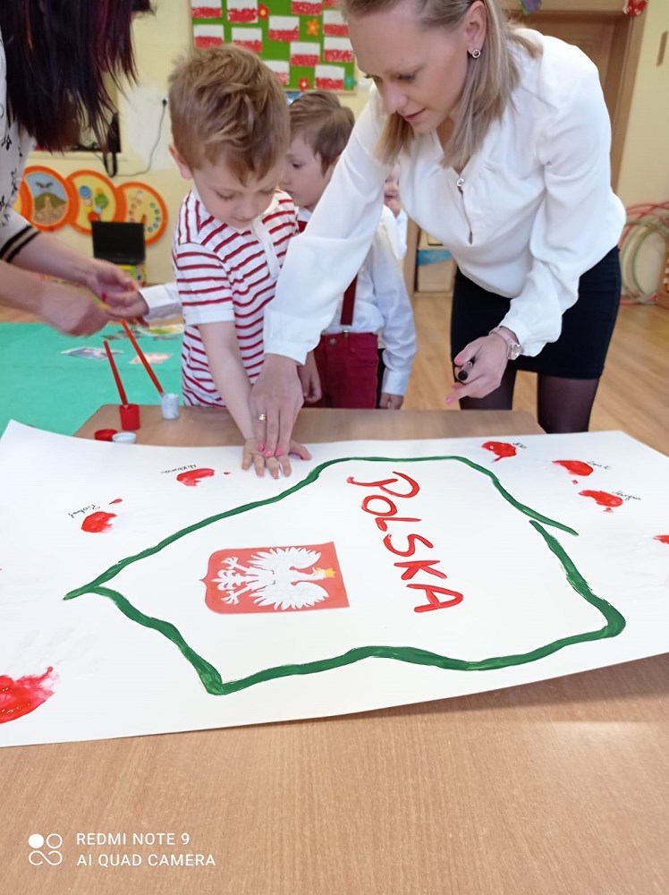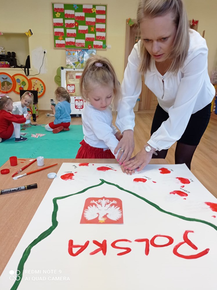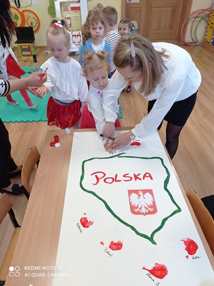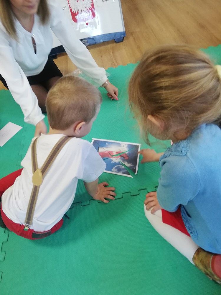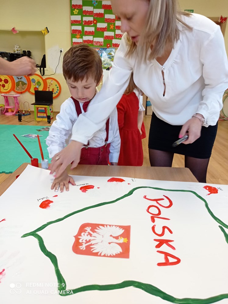 Przedszkolaki poznały symbole narodowe: godło, flagę oraz hymn Polski. Wspólnie wykonały plakat patriotyczny. Na zakończenie dnia, wspólnie odśpiewały piosenki patriotyczne oraz hymn Polski. Każdy przedszkolak wykonał samodzielnie biało – czerwoną flagę.