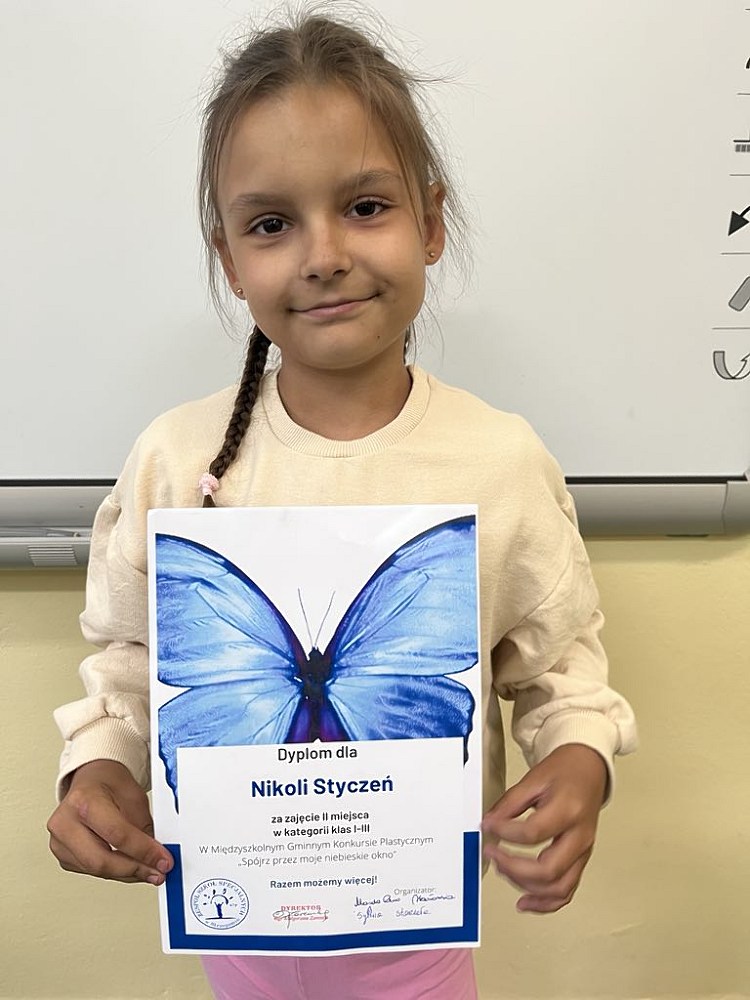 Uczennica klasy 1a jaroszowskiej szkoły zajęła II miejsce w kategorii klas I–III w Międzyszkolnym Gminnym Konkursie Plastycznym „Spójrz przez moje niebieskie okno”.