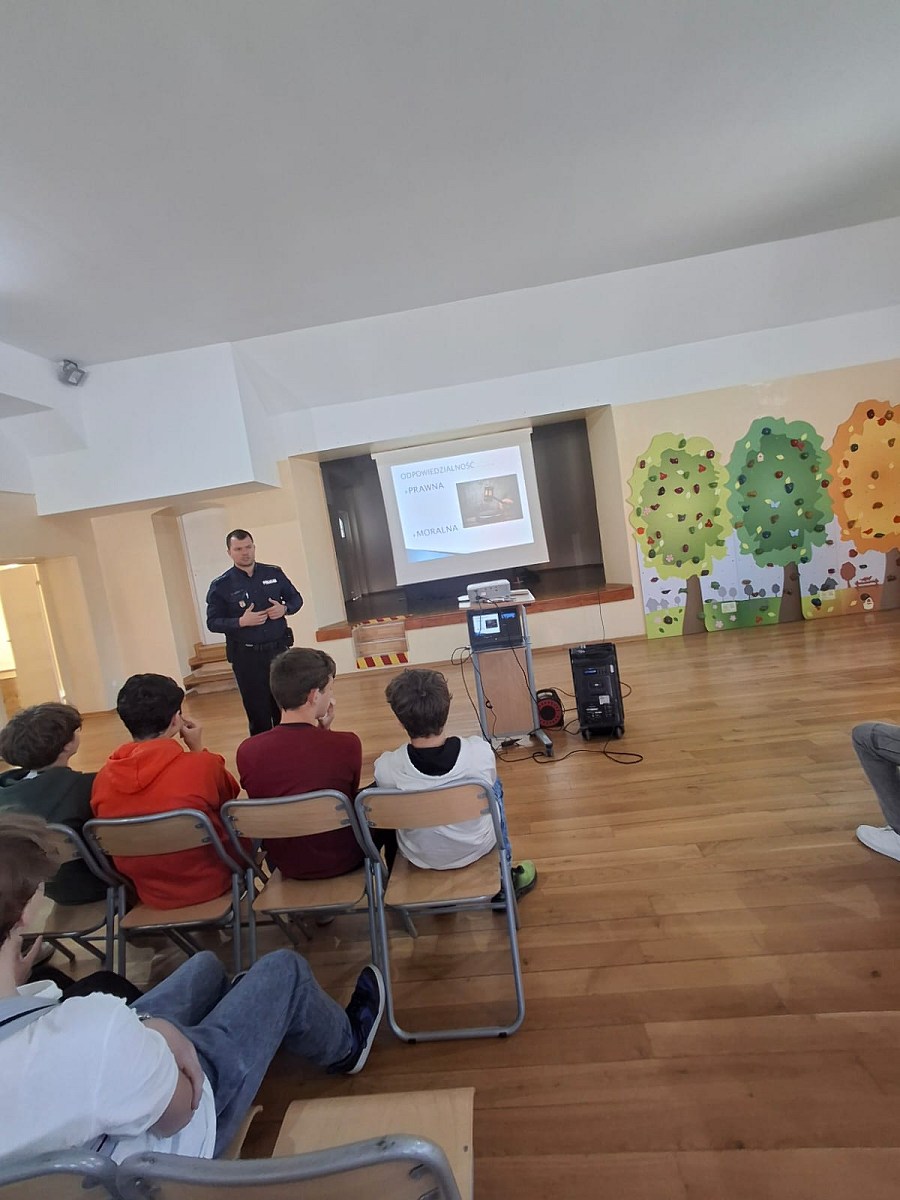 W poniedziałek, 28 kwietnia 2025 r. Zespół Szkolno-Przedszkolny w Jaroszowie odwiedzili szczególni goście: młodszy aspirant Michał Rzepecki (specjalista ds. nieletnich) z Powiatowej Komendy Policji w Świdnicy oraz młodszy aspirant Robert Wiśniewski (dzielnicowy) z Komendy Policji w Strzegomiu, którzy przeprowadzili prelekcje i warsztaty profilaktyczne dla uczniów.
