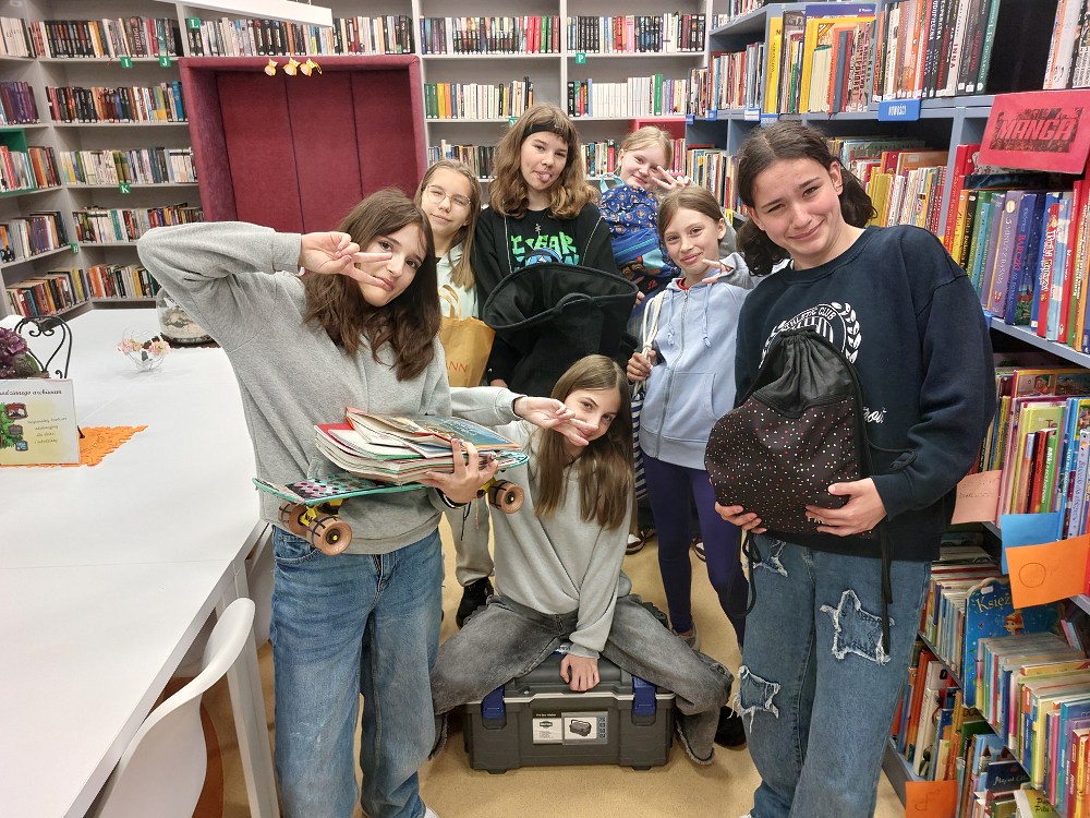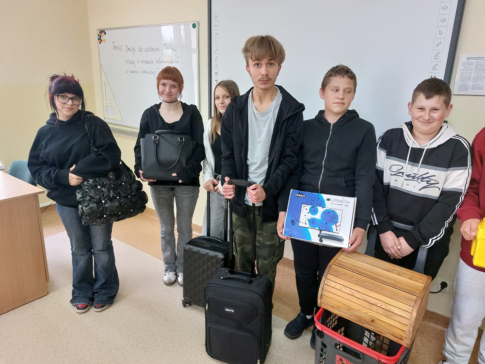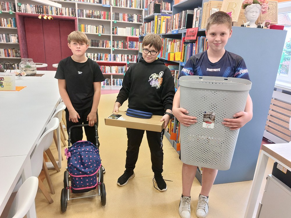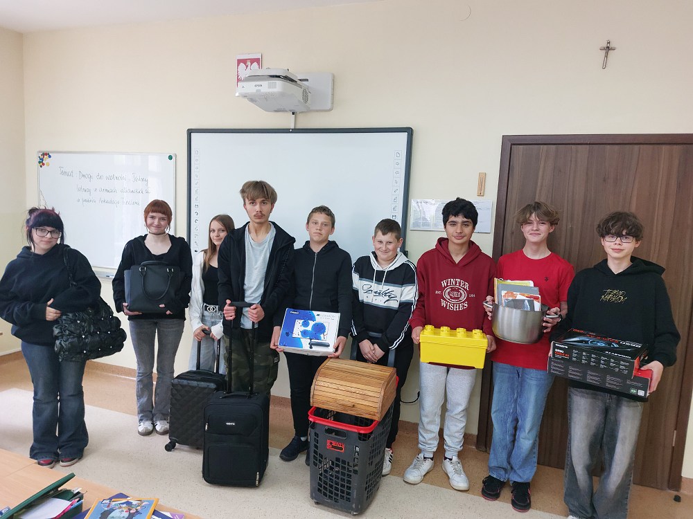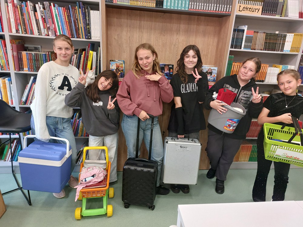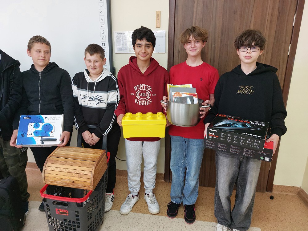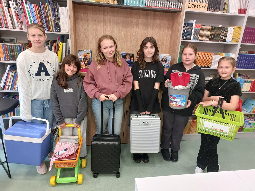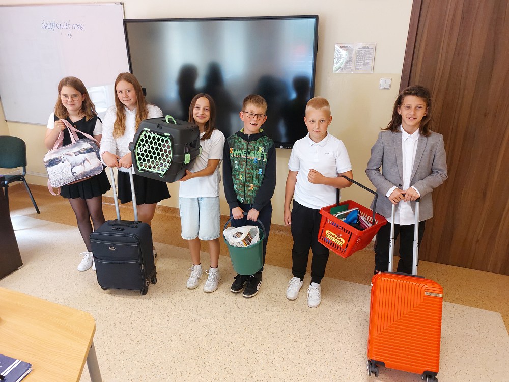 Dobra zabawa, kreatywność, śmiech i podziw innych uczniów – towarzyszyły tego dnia tym, którzy podjęli wyzwanie i spakowali podręczniki, zeszyty i przybory szkolne do dziecięcych wózków, klatek dla zwierzątek, wiaderek, walizek, skrzynki na narzędzia, koszyków na zakupy i in. Wszystkich zaskoczył Wojtek Kurzeja z klasy 7a, który do szkoły przyszedł ze srebrnym garnkiem, a jego kolega z klasy Dawid Kobyłczyk spakował się w drewniany chlebak i wózek marketowy.