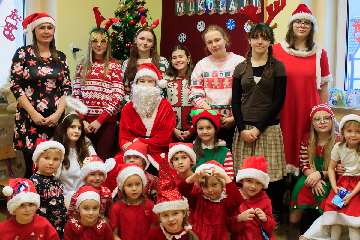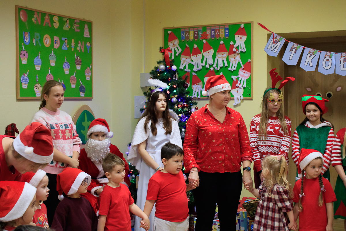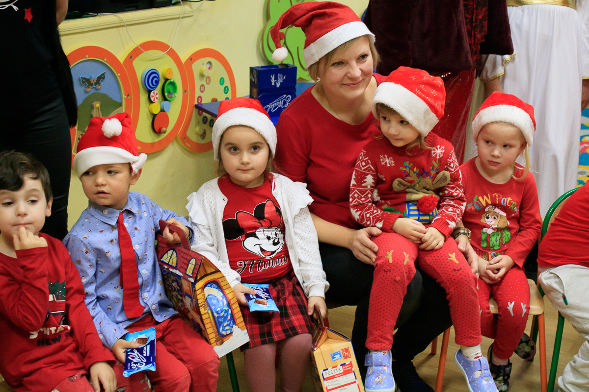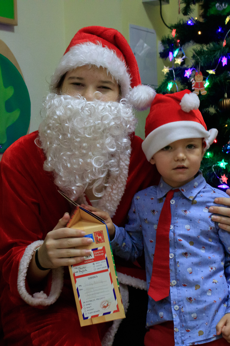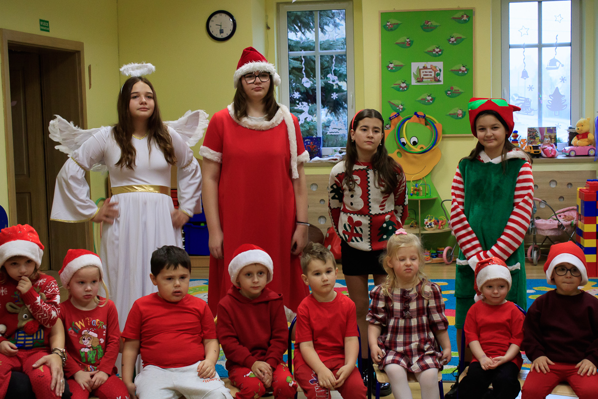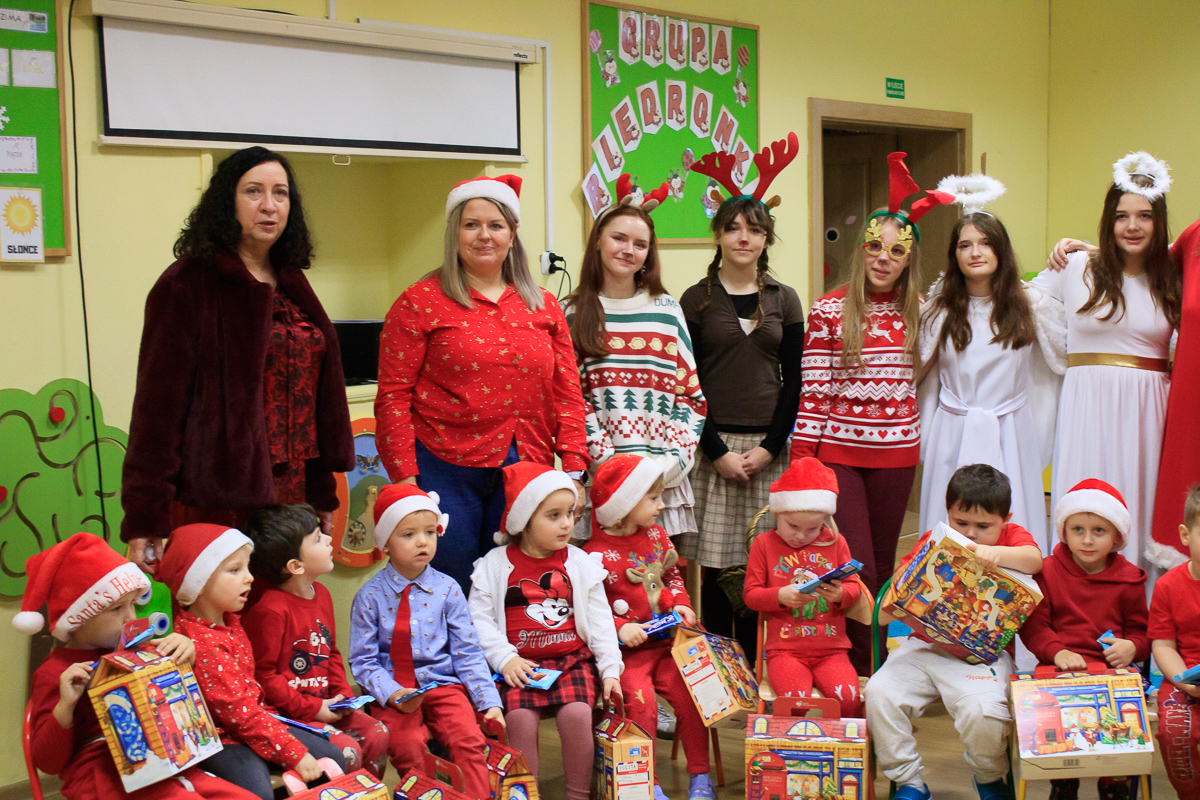 Po zakończeniu wizyt w budynku szkoły, barwny orszak przemaszerował do przedszkola, gdzie dzieciaki były bardzo zaskoczone niecodziennymi gośćmi. Były piosenki, życzenia i wierszyki dla Mikołaja oraz oczywiście prezenty i wspólna zabawa. Uczniom i przedszkolakom towarzyszyła także dyrektor szkoły – Beata Jankiewicz.