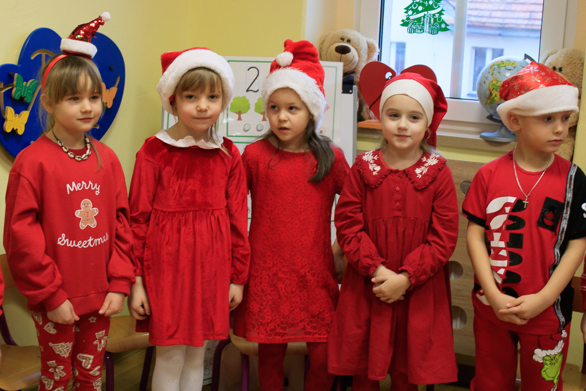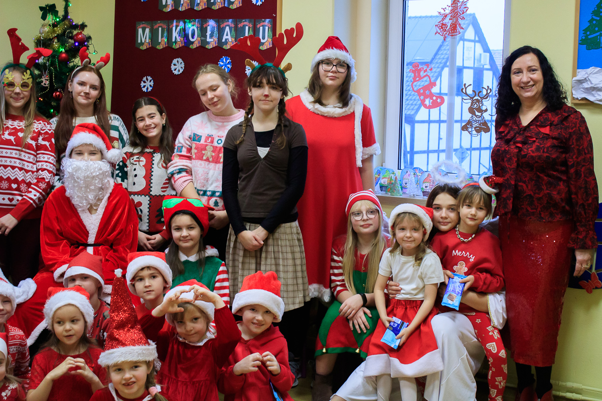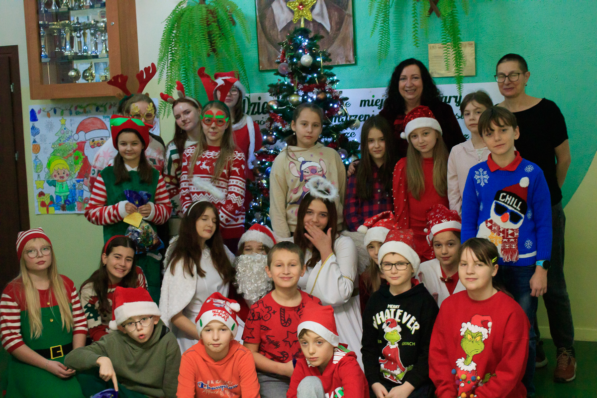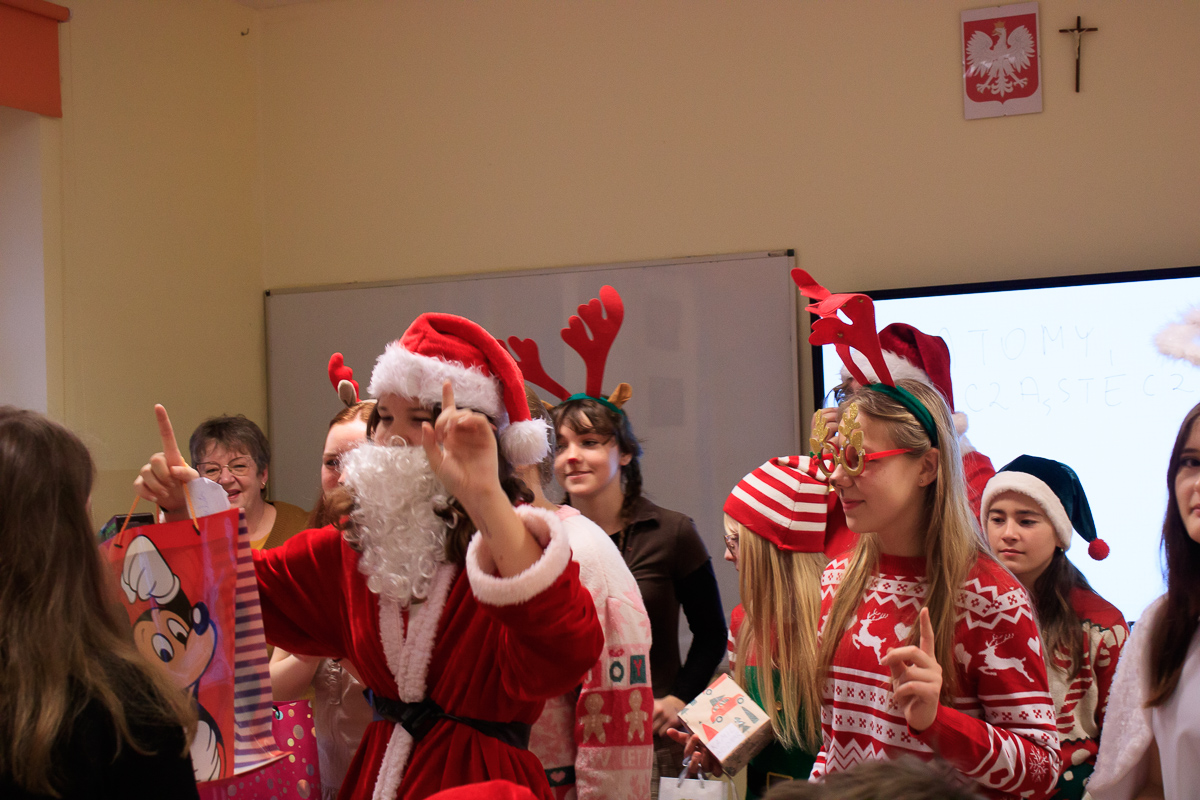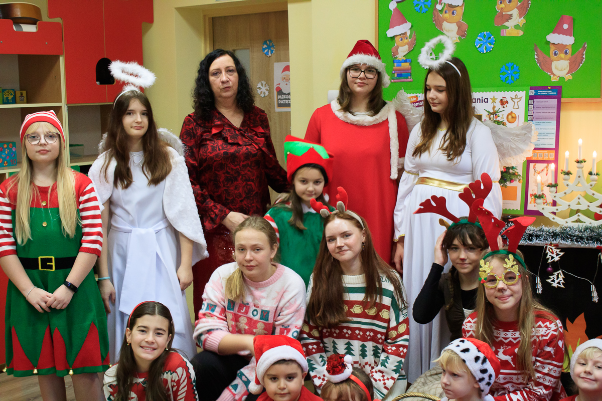 Po zakończeniu wizyt w budynku szkoły, barwny orszak przemaszerował do przedszkola, gdzie dzieciaki były bardzo zaskoczone niecodziennymi gośćmi. Były piosenki, życzenia i wierszyki dla Mikołaja oraz oczywiście prezenty i wspólna zabawa. Uczniom i przedszkolakom towarzyszyła także dyrektor szkoły – Beata Jankiewicz.