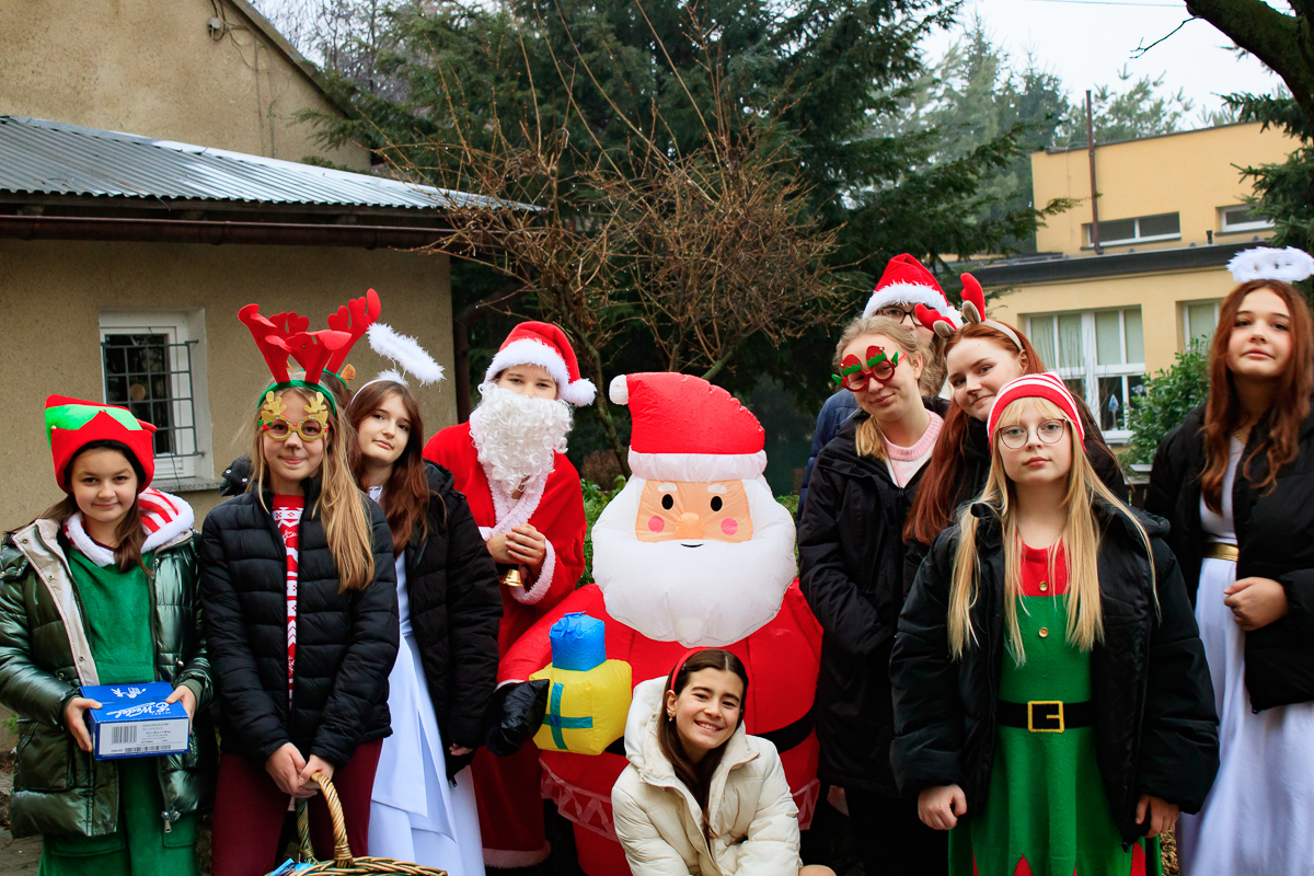 Orszak odwiedził uczniów z klas 1 – 8 rozdając im prezenty i czekolady. Było wesoło, radośnie i głośno, bo grała świąteczna muzyka i śpiewali uczestnicy orszaku.