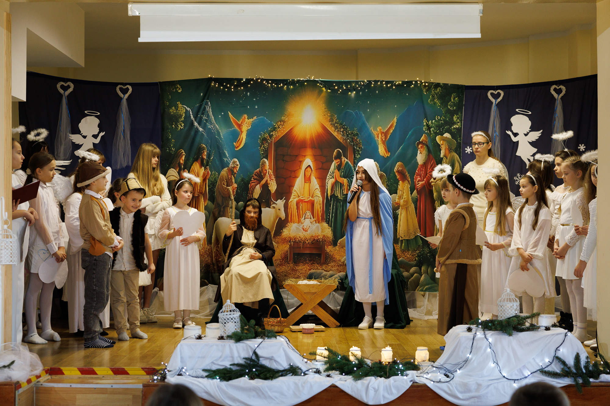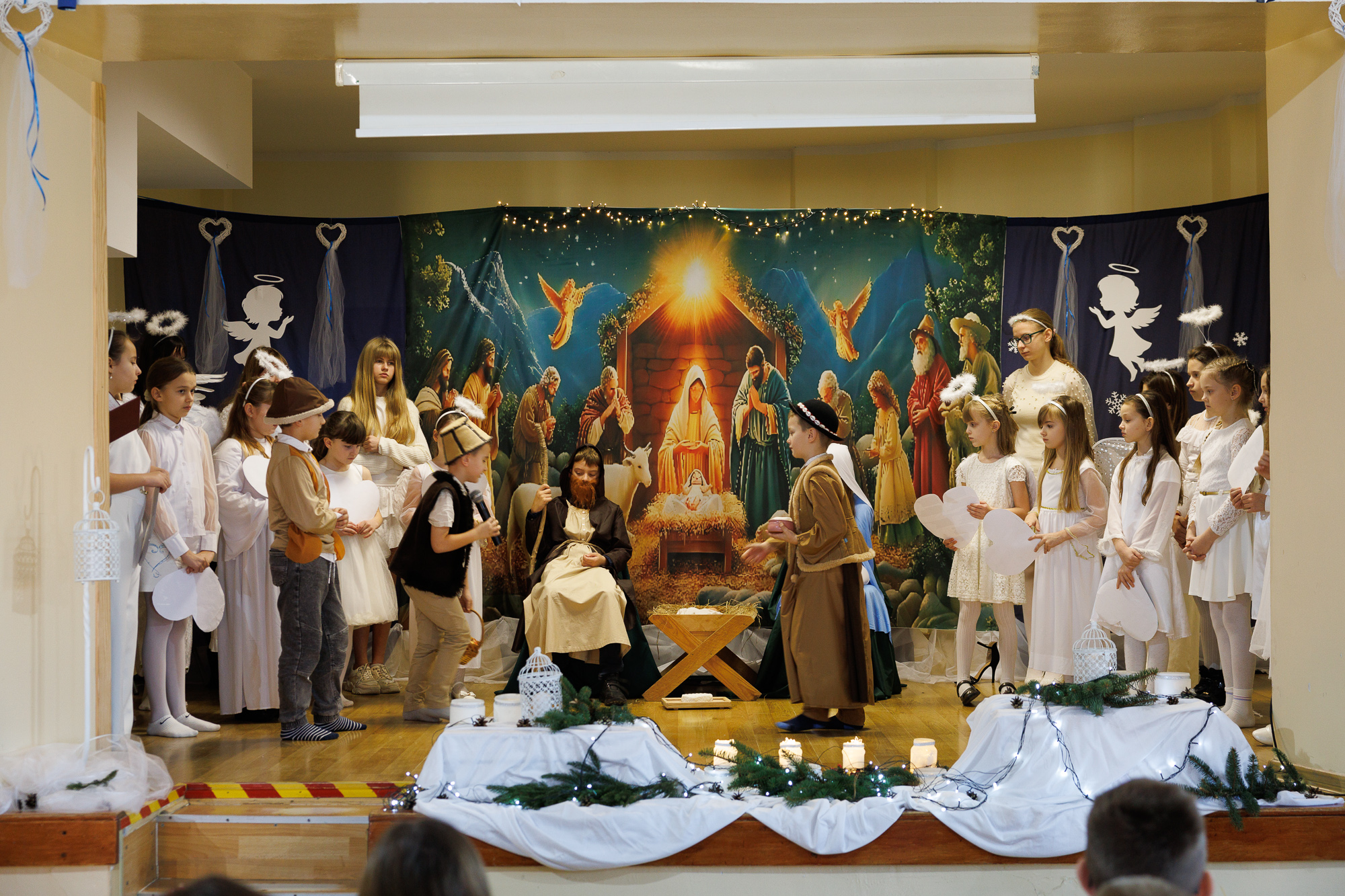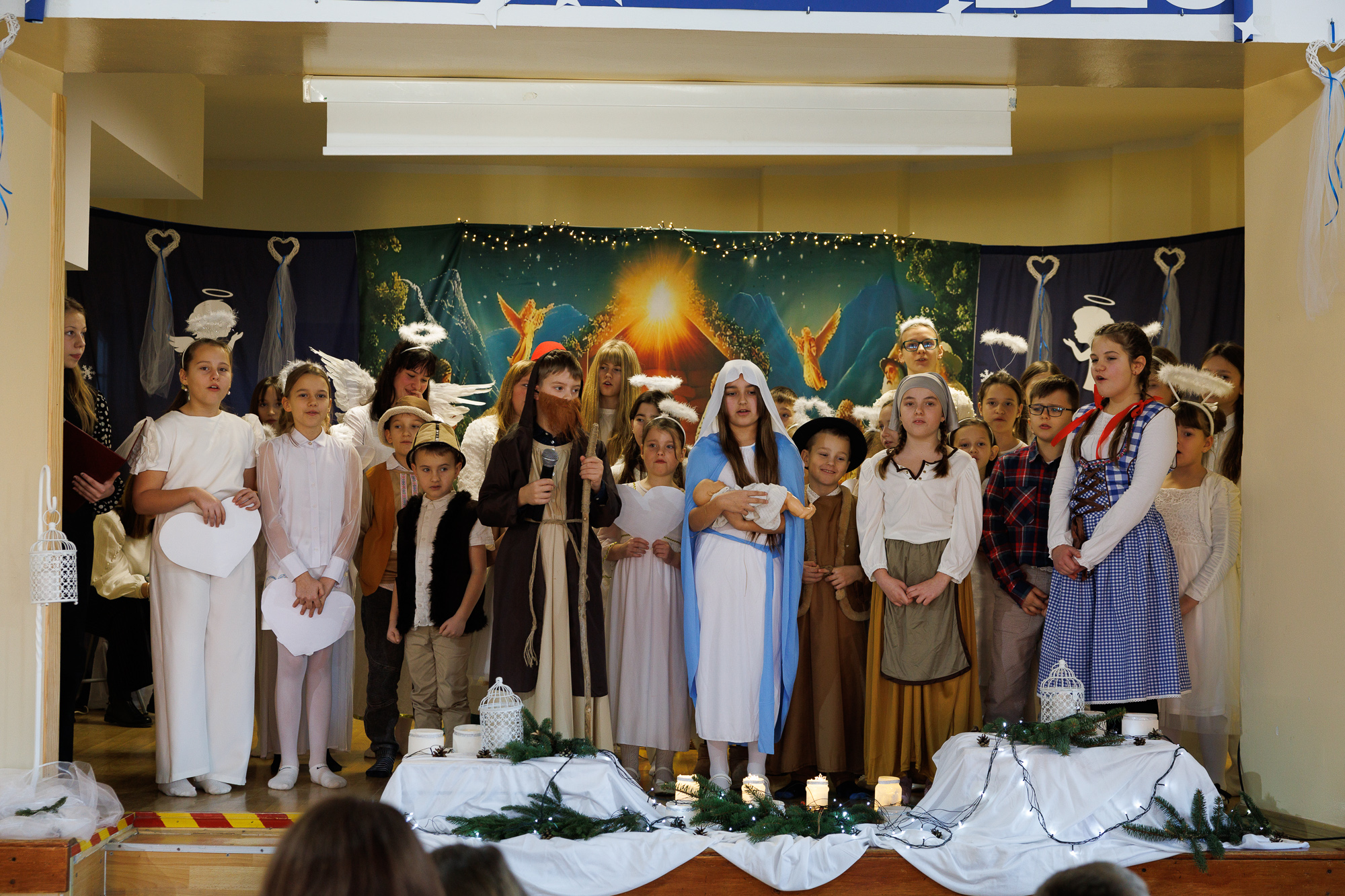 Przedstawienie bożonarodzeniowe wprowadziło uczniów, nauczycieli oraz zaproszonych gości w radosną atmosferę wigilii szkolnej i tradycyjnego wspólnego kolędowania, które zakończyły zajęcia szkolne przed zimową przerwą świąteczną.