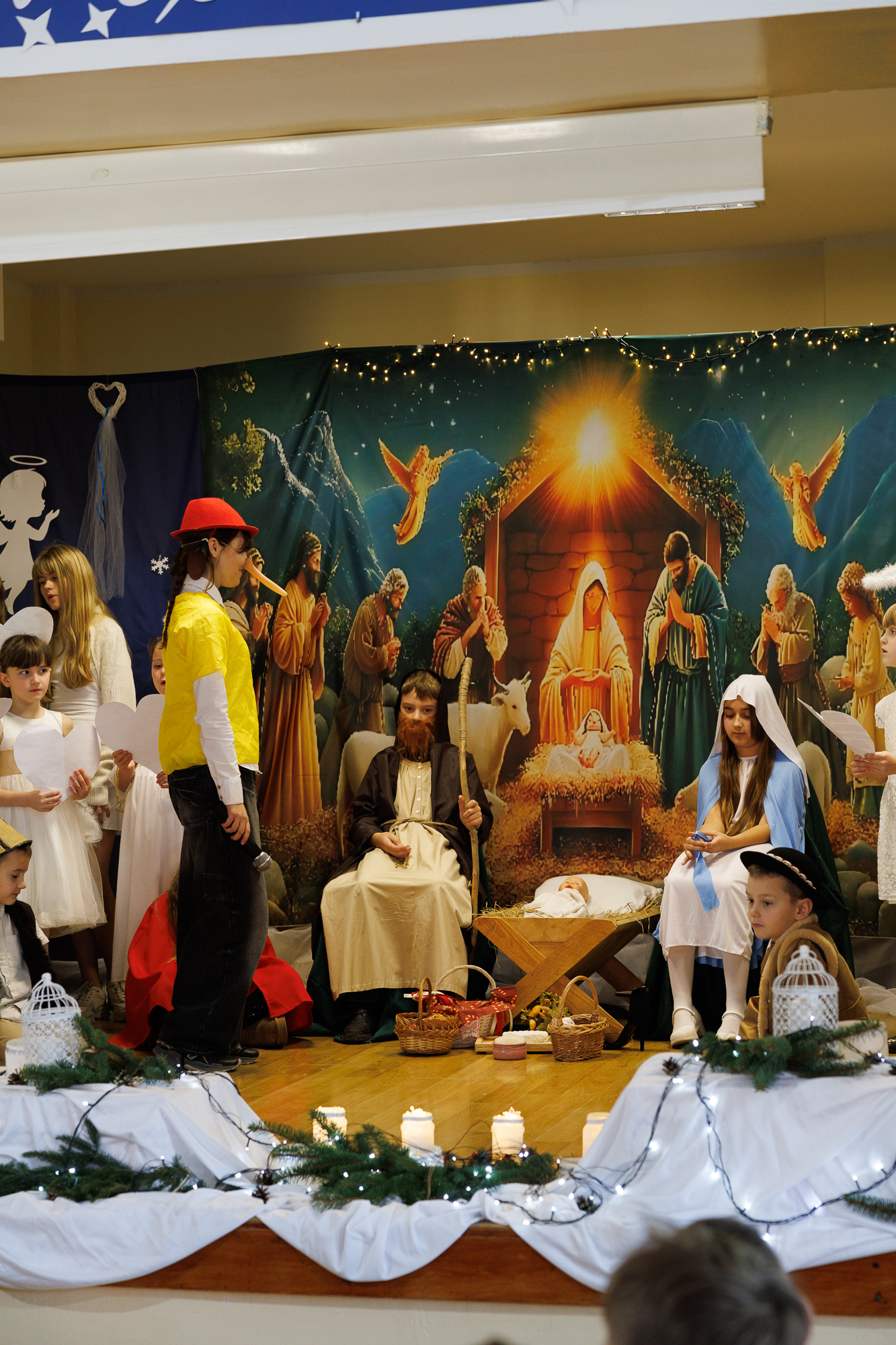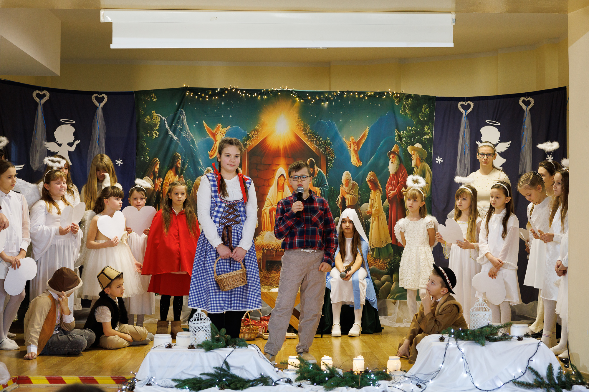 W tegorocznych Jasełkach wystąpili: Layla Jarzmik (Maryja), Antoni Nycz (św. Józef), Magdalena Kossowicz (narrator), pasterze: Tomasz Łata, Franciszek Głód i Piotr Rychel, aniołowie: Melania Ciepła, Maja Czapla, Zofia Czapla, Wiktoria Dobrowolska (wokalistka), Magdalena Dworak, Zuzanna Gajos, Amelia Grajna, Leonie Gajewska, Joanna Brokos, Władysława Fomenko, Zofia Kogut, Natalia Kowalska, Eliza Łosiak, Marcelina Łyczak, Emilia Mrozek, Joanna Różańska, Adrianna Senczyna, Wiktoria Senczyna, Klaudia Szymańska, Martyna Szymańska i Laura Świątek, bohaterowie znanych bajek: Zuzanna Miklaszewska (Czerwony Kapturek), Karol Pieszko (Jaś), Zuzanna Kaszuba (Małgosia), Klaudia Hordyńska (Sierotka Marysia), Zuzanna Rychel (Calineczka, wokalistka), Anna Szczepek (Pinokio) i Błażej Wiraszka (Rybak ze złotą rybką). Gra aktorska uczniów oraz śpiew kolęd i pastorałek zostały wzbogacone dopasowanymi do danej sytuacji scenicznej podkładami muzycznymi.