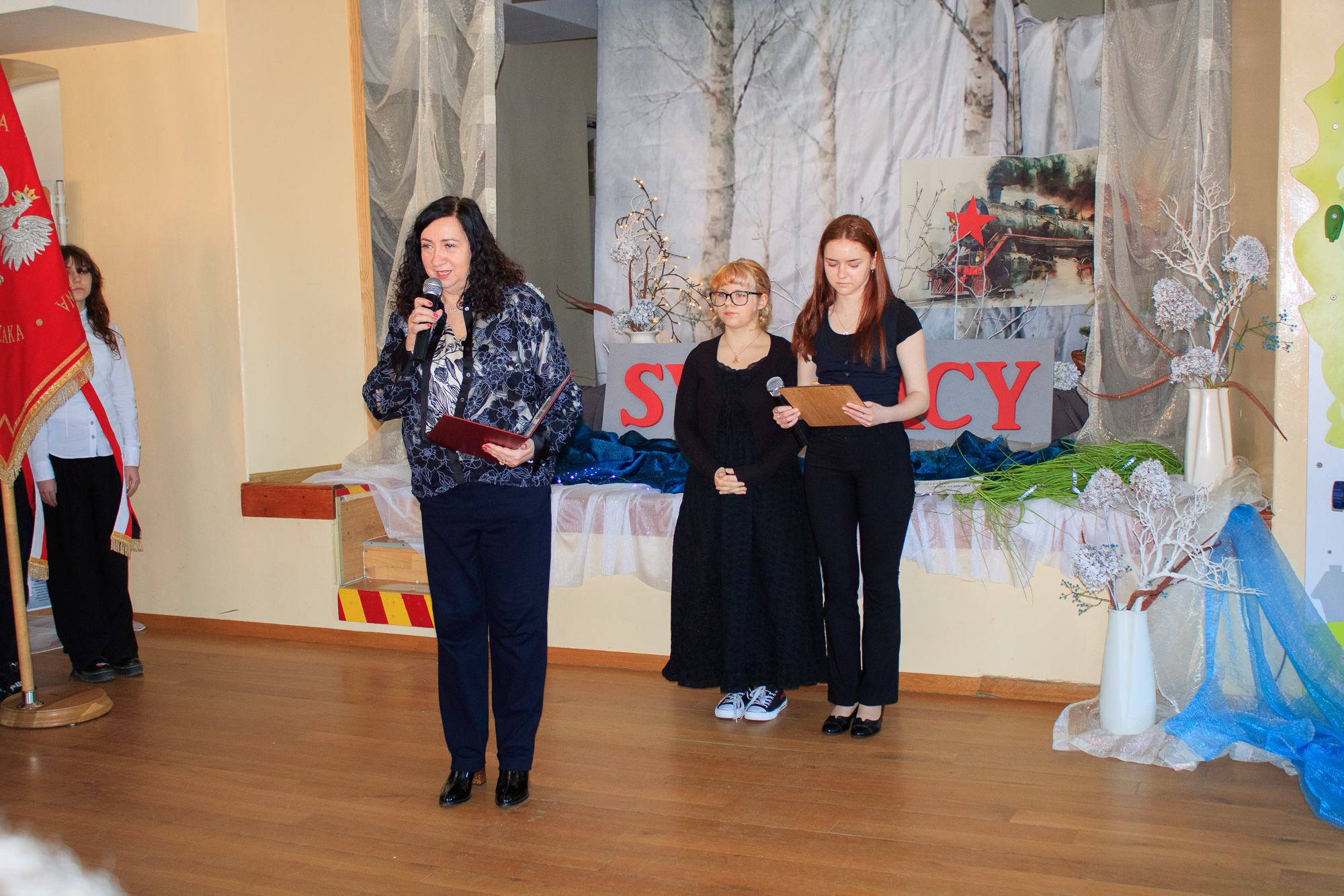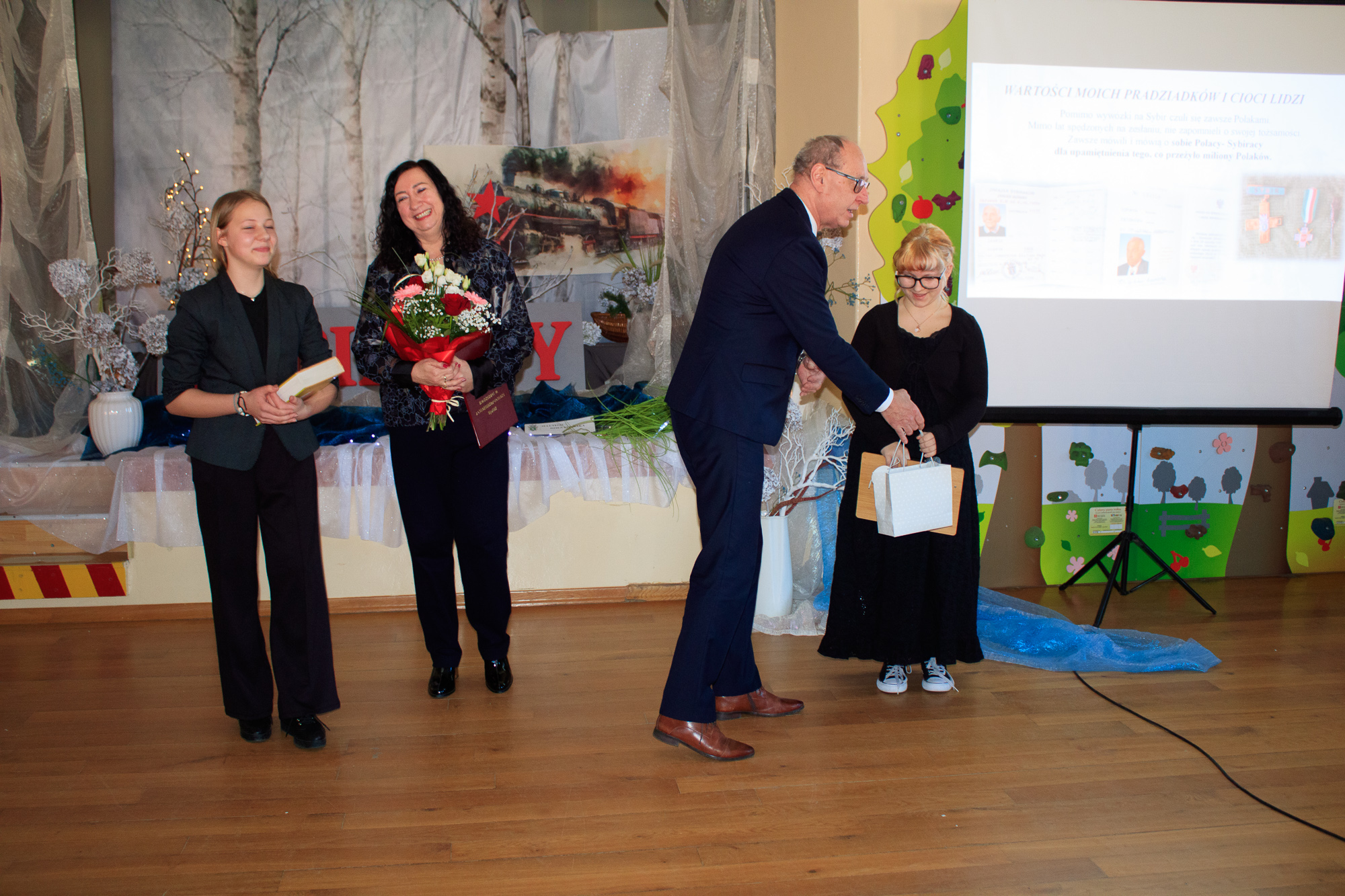 Na początku dyrektor szkoły Beata Jankiewicz serdecznie powitała przybyłych gości: Romana Asyngera – prezesa Koła Związku Sybiraków w Strzegomiu, Józefa Białka – sekretarza Koła Związku Sybiraków oraz Marcina Kossowicza - rodzica uczennicy kl.8 - Magdaleny.