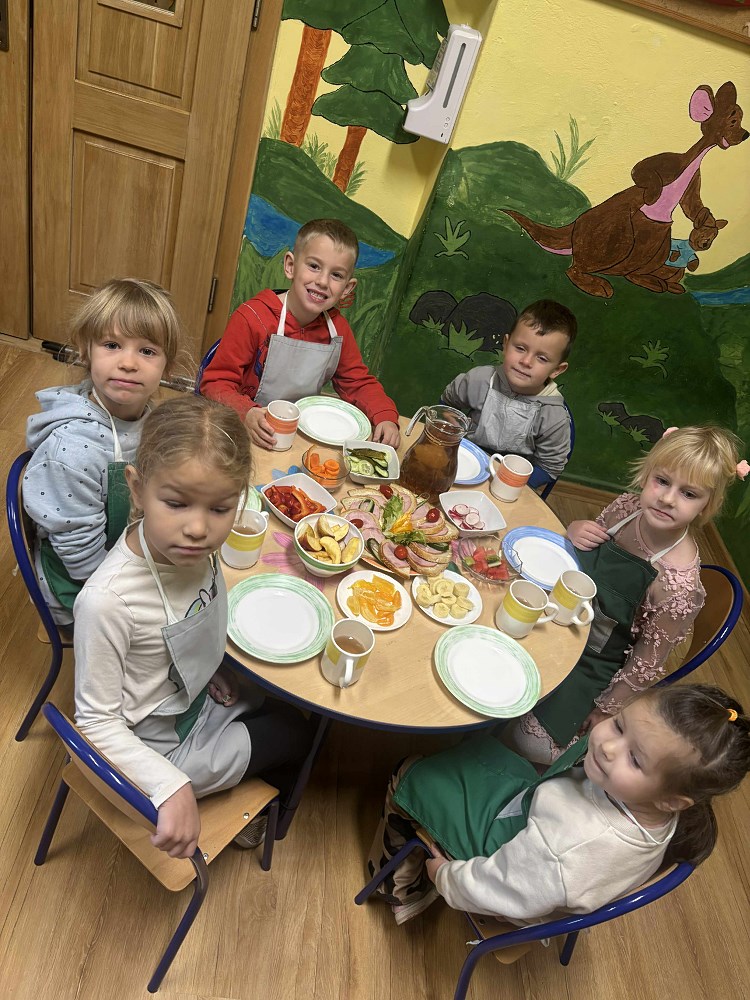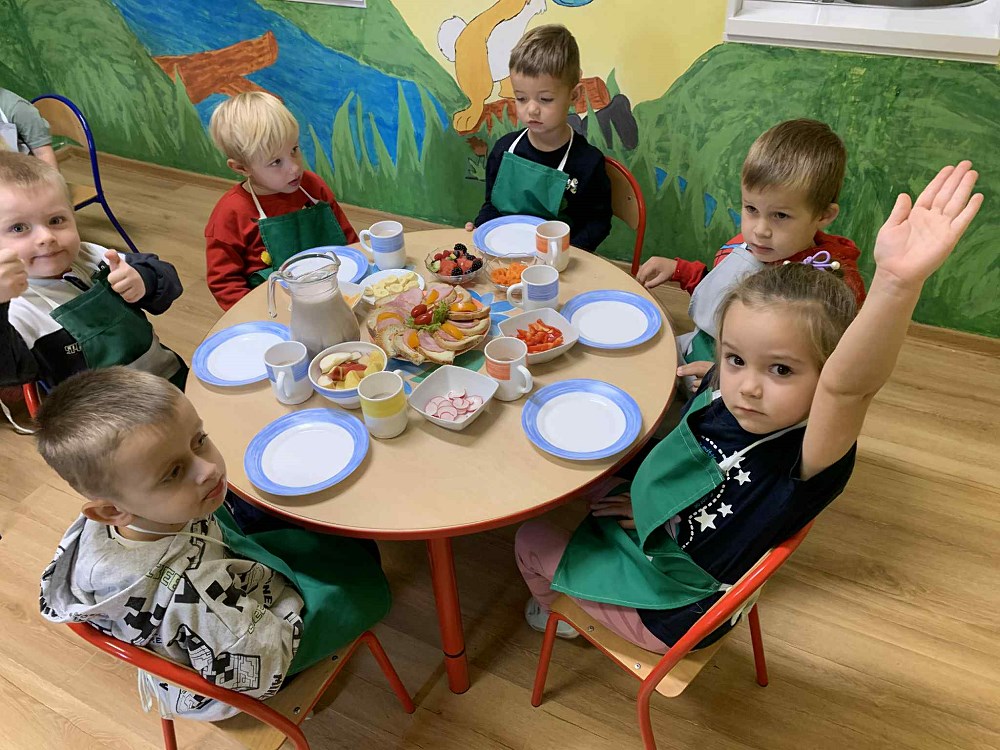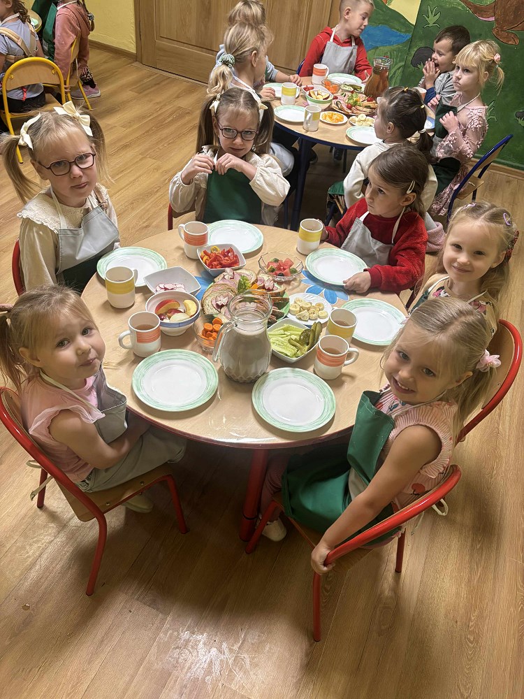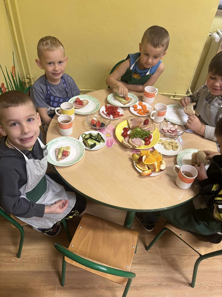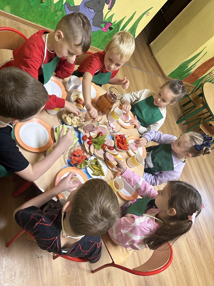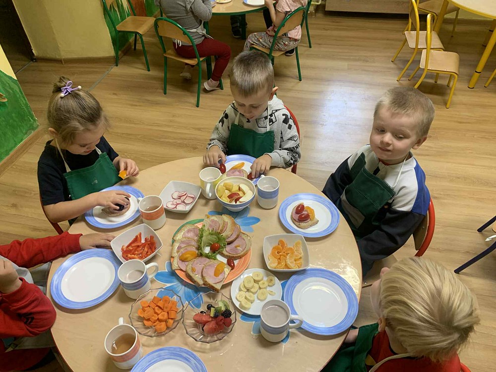 Celem akcji było przypomnienie, jak ważne jest codzienne spożywanie zdrowego śniadania oraz nauka prawidłowych nawyków żywieniowych już od najmłodszych lat. Dzieci przyniosły z domu zdrowe produkty – świeże owoce, chrupiące warzywa, sery, wędliny, a także naturalne jogurty. Po krótkiej rozmowie o wartościach odżywczych i znaczeniu pierwszego posiłku w ciągu dnia, przedszkolaki zabrały się do pracy.