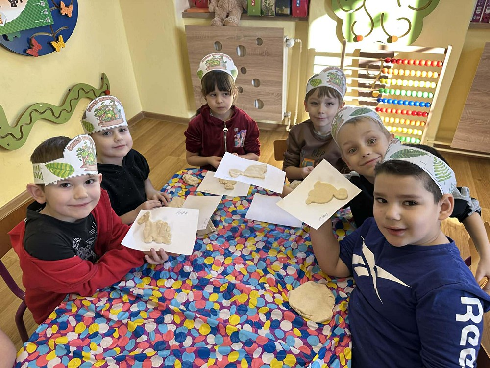 W programie dnia znalazły się liczne zabawy ruchowe oraz prace plastyczne – dzieci tworzyły kolorowe dinozaury z talerzyków oraz masy solnej.