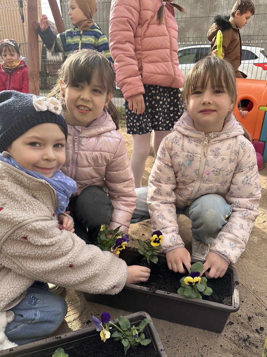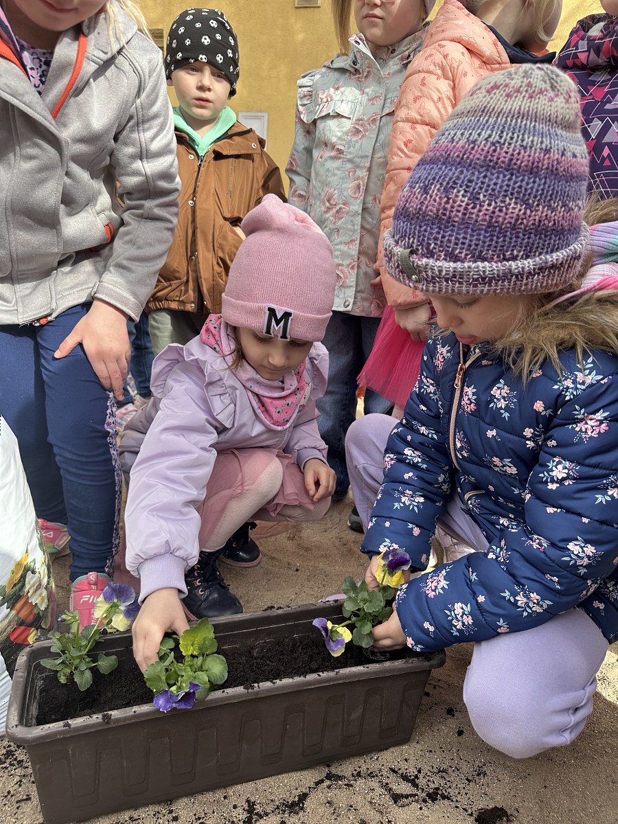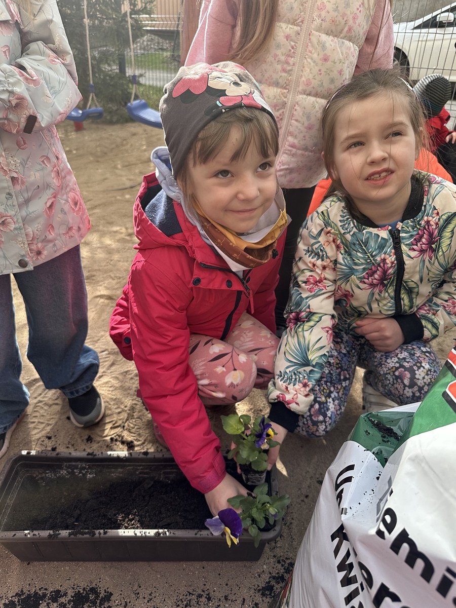 Po powrocie do przedszkola na dzieci czekało kolejne zadanie – sadzenie bratków. Przedszkolaki z ogromnym zaangażowaniem posadziły kwiaty, które już wkrótce ozdobią przedszkolny ogródek. Była to nie tylko świetna zabawa, ale także cenna lekcja dbania o rośliny i środowisko.