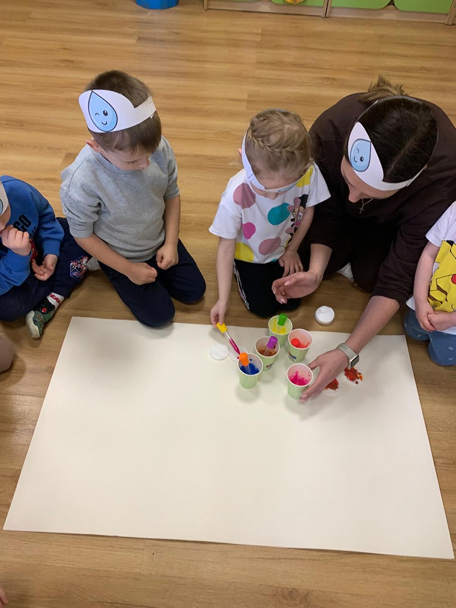 Podczas spotkania dzieci dowiedziały się, do czego wykorzystywana jest woda. Były prowadzone z dziećmi rozmowy o tym, że woda jest niezbędna do picia, gotowania, mycia, podlewania roślin, a także do życia ludzi, zwierząt i roślin. Przedszkolaki chętnie dzieliły się swoimi spostrzeżeniami i doświadczeniami związanymi z wodą.